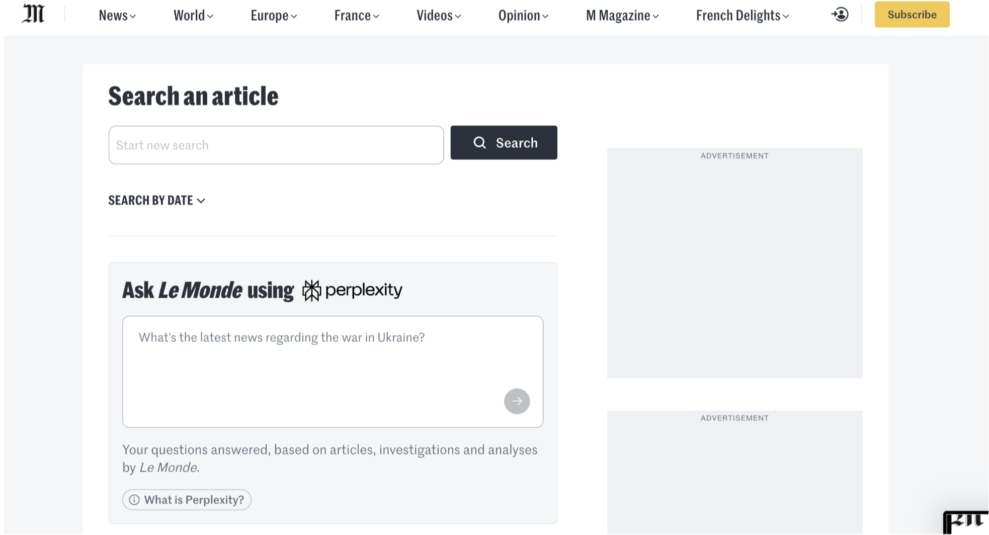 Ещё одно ИИ-обновление в издании – ИИ-поиск по сайту. Le Monde подключила к классическому поиску окошко ответов с Perplexity. Читатели могут задать вопрос о политике или новостях, а ИИ-агент сгенерирует ответ на основе материалов издания со ссылками на них. Редакция не опасается, что количество подписчиков снизится из-за Perplexity-окошка: действуют строгие правила, не позволяющие читать полные версии статей бесплатно – ни гостям, ни незарегистрированным пользователям.